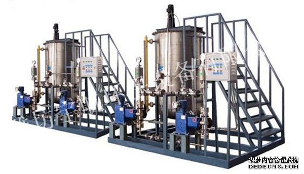 加药装置主要由溶液箱、搅拌箱(带搅拌器)、计量泵、液位计、电控柜、管路、阀门、安全阀、止回阀、压力表、过滤器、底座、扶梯等组成(可根据用户实际要求配置)。