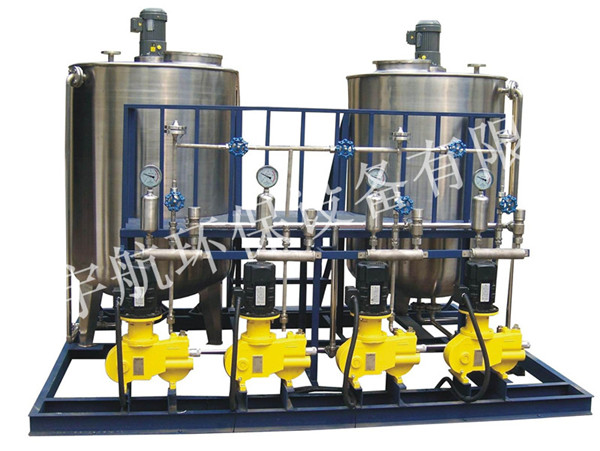 加药装置主要由溶液箱、搅拌箱(带搅拌器)、计量泵、液位计、电控柜、管路、阀门、安全阀、止回阀、压力表、过滤器、底座、扶梯等组成(可根据用户实际要求配置)。