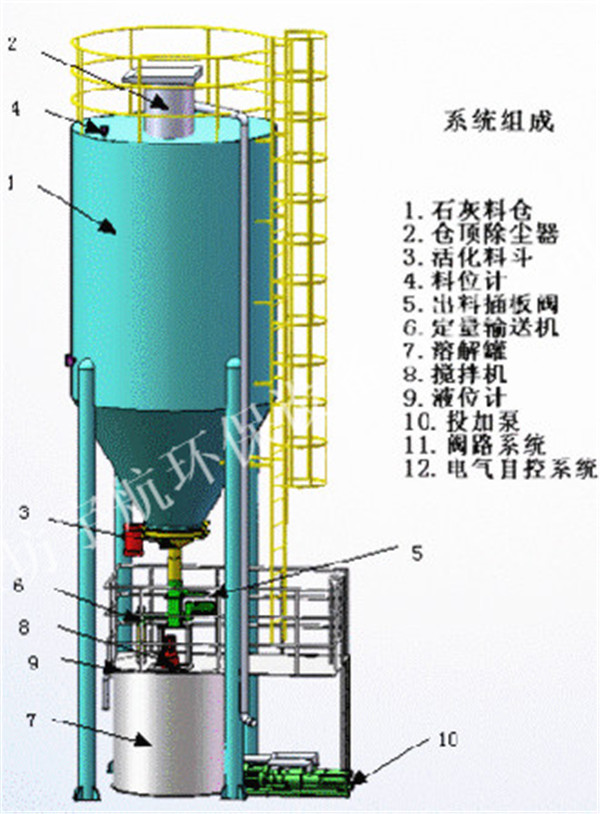 石灰料仓、仓顶除尘器、活化料斗、料位计、出料插板阀、螺旋输送机、溶解罐、搅拌机、磁翻板液位计、螺杆泵、管路系统、电器自控系统。
